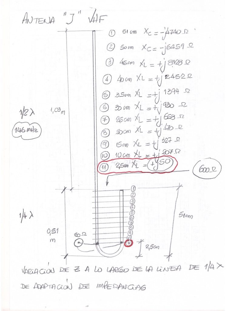 VARIACION DE «Z» A LO LARGO DE LA LINEA DE UN CUARTO DE ONDA DE ADAPTACION EN LA ANTENA J